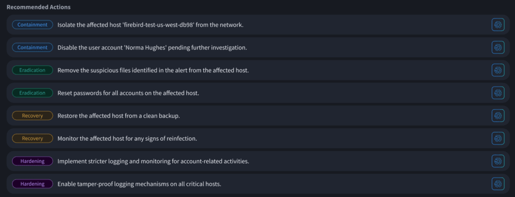 Once an alert is determined to be important, it is elevated to a case, and the remediation process begins. The Investigation Agent details the case, along with other similar cases, to compile a comprehensive response plan. Each step is spelled out along with prebuilt automations to execute each step of the plan.