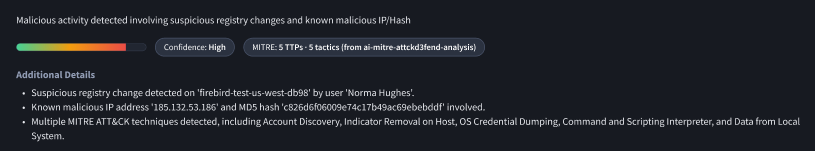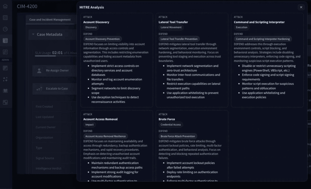 Further analysis and suggested actions are suggested by the Hero AI MITRE Agent, generating clear MITRE ATT&CK and D3FEND guidelines for next steps.