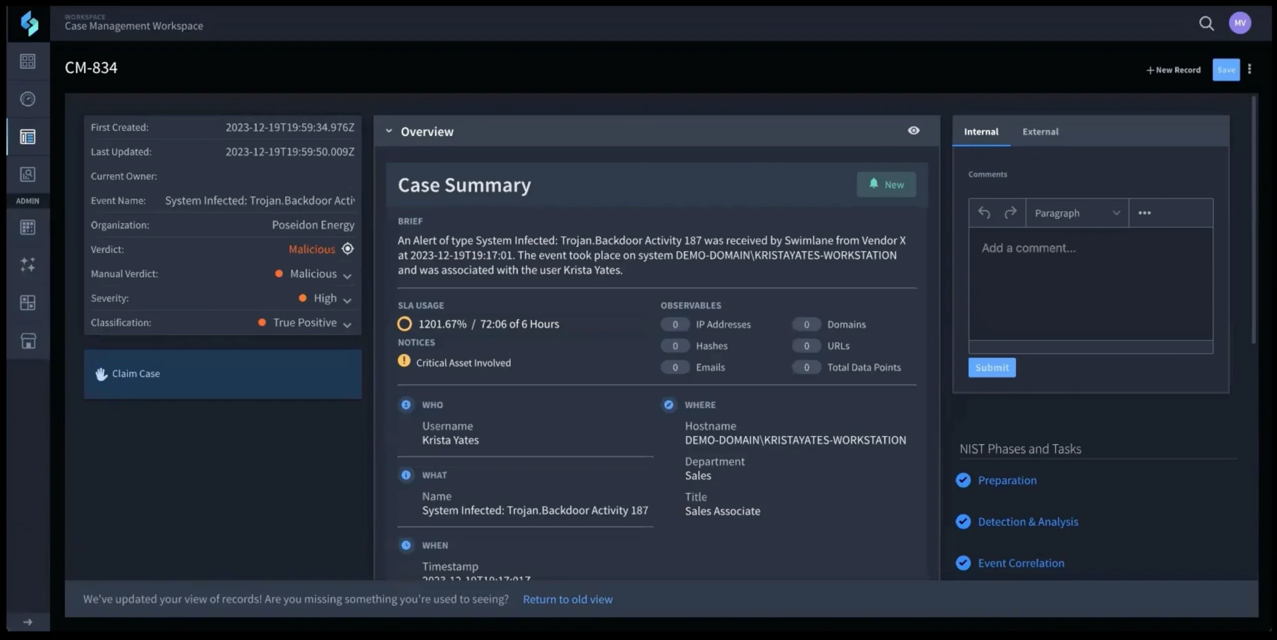 Optimize case management with custom fields like verdict, severity, classification, and timestamps.
