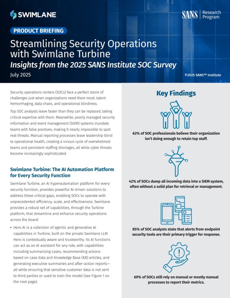 Discover how Swimlane Turbine, our AI hyperautomation platform, can revolutionize your security operations. Turbine provides powerful, AI-driven solutions to help your SOC achieve unprecedented efficiency, scale, and effectiveness.