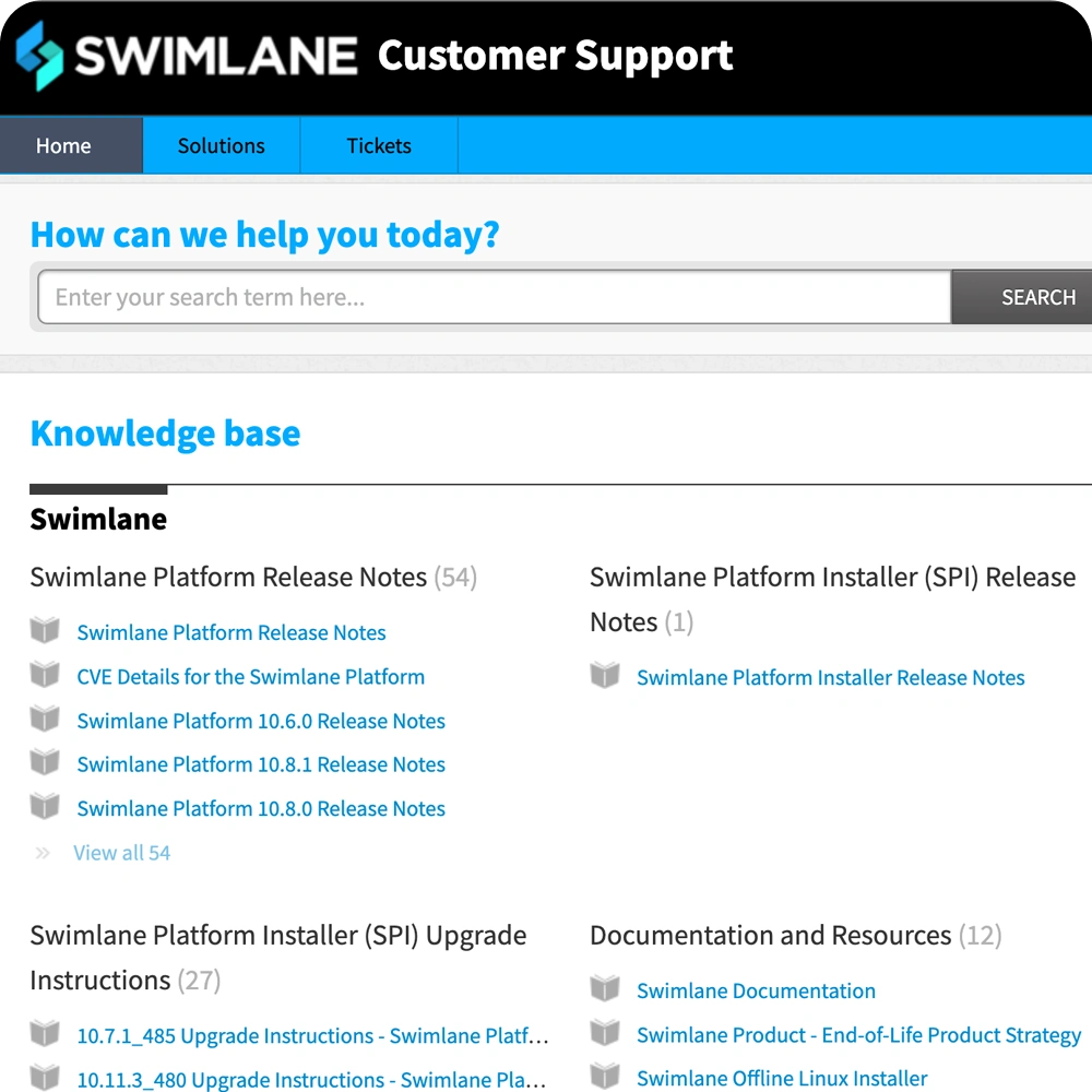 The Swimlane support portal allows you to submit a question, feature request or bug report all in one place. Then our team of expert support engineers work with you to find the best solution. Live support options during business hours are also available*.