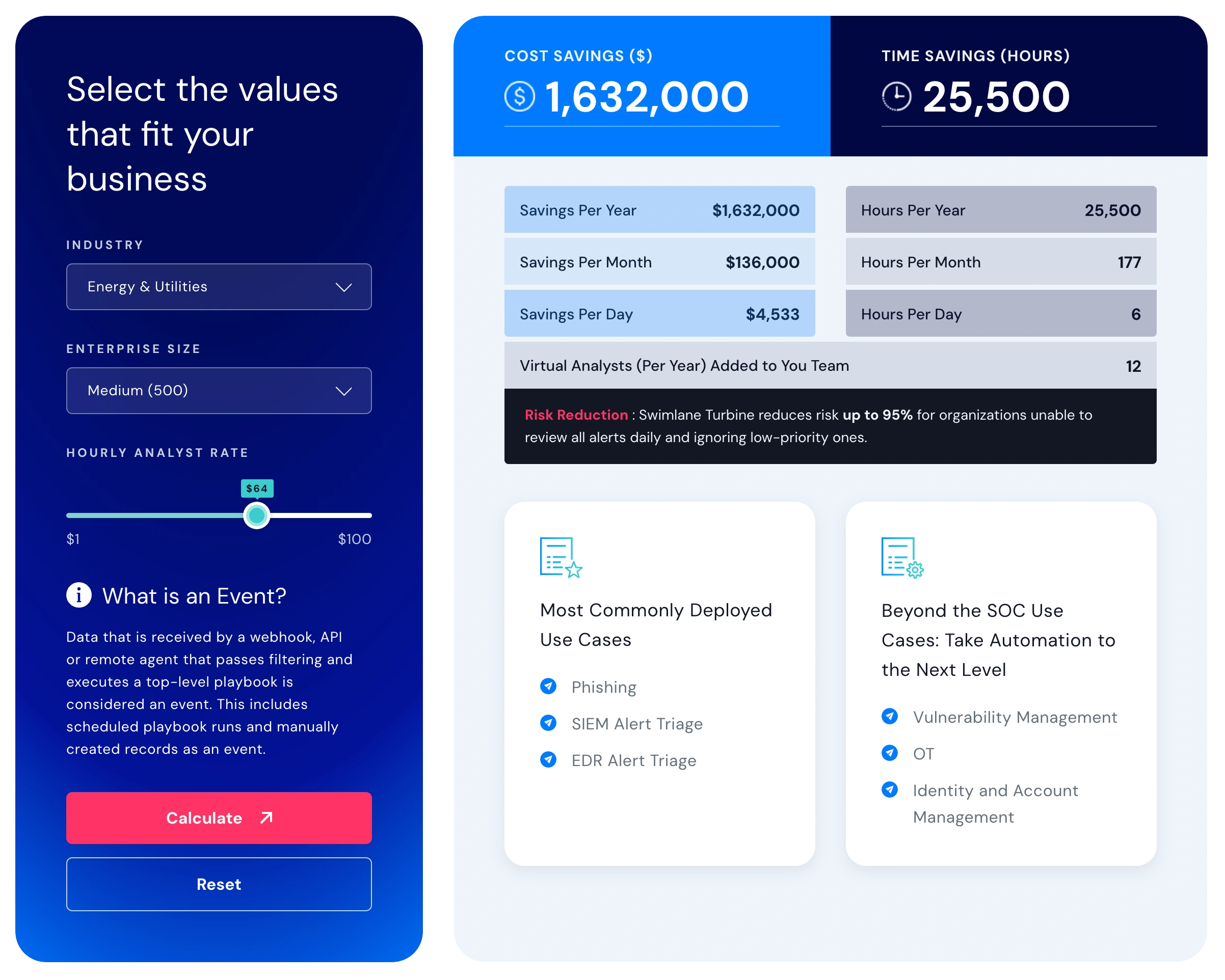An independent return on investment (ROI) study conducted by TAG Cyber revealed 240% ROI for Swimlane Turbine. Read the ROI report to unpack the analysis, or use this calculator to estimate your organization’s ROI with Swimlane.
